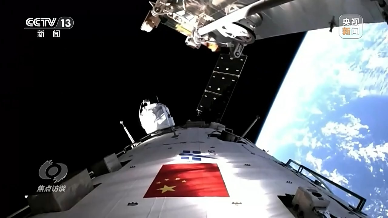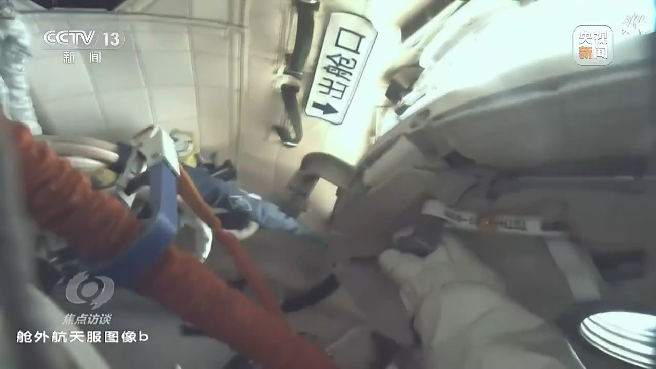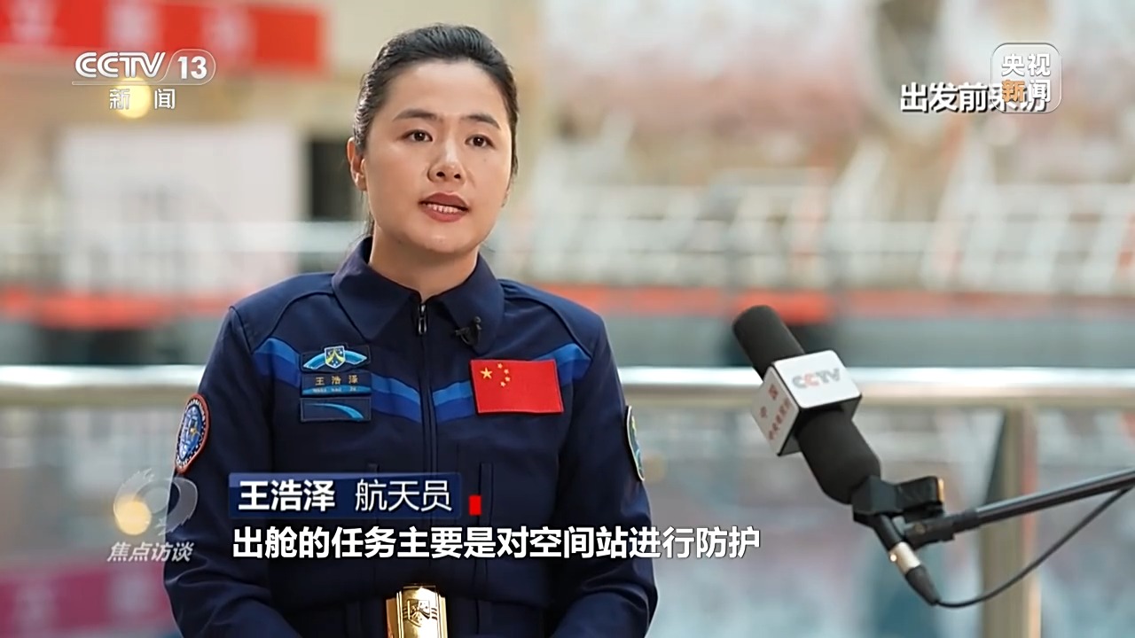 航天员 王浩泽:出舱的任务主要是对空间站进行防护。因为在空间里面运行,空间站它有可能会受到微流星、空间碎片干扰,甚至是冲击,所以我们要对舱外的一些重要管路、设备进行防护。