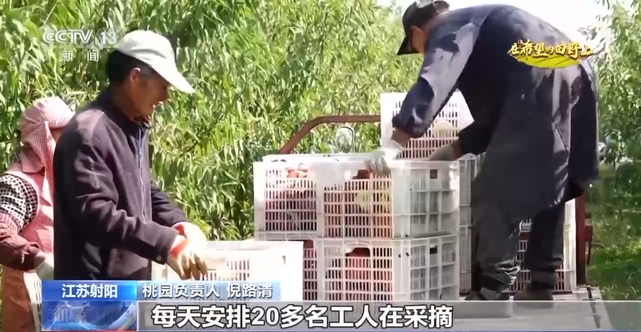 在盐城市射阳县新坍镇的一处桃园种植了4万多株桃树。果农们忙着摘桃、分拣、装筐,预计整个采摘销售期能持续一个月左右。