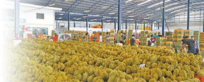 在位于泰国尖竹汶府的优果东明水果厂,经过分拣和清洁处理的榴莲按品级分类整齐堆放、等待装箱。