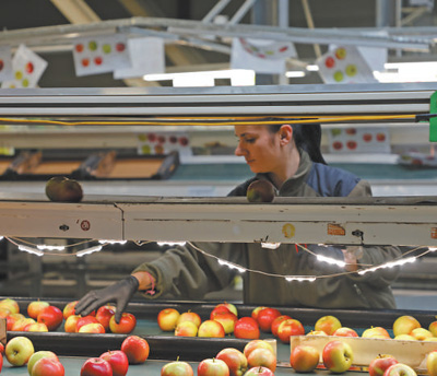 波兰格鲁耶茨县一家苹果加工企业内,当地工人正在分拣苹果。