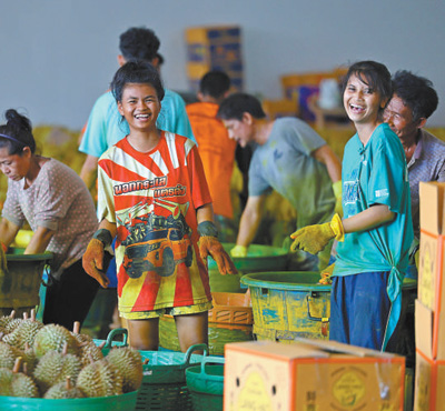 在优果东明水果厂,当地工人对榴莲进行清洁处理。