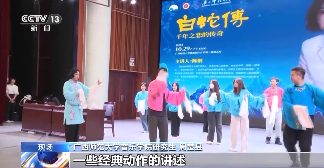 广西师范大学音乐学院研究生 周楚昱:我亲身体验了一些练习,比如团扇、水袖等。我觉得陈老师带来的这些戏曲元素、一些经典动作的讲述,对于我们学习艺术、感受艺术,有更好的帮助和启迪。
