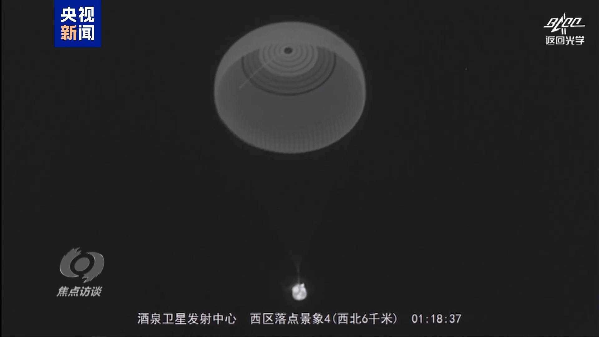 着陆反推发动机点火,降落伞脱落,神舟十八号飞船稳稳地落在地面。几乎同时,空中分队的飞机也降落在飞船附近,他们也同样通过了深夜回收的考验。