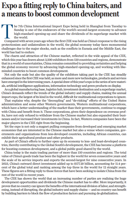 中国对欠发达和最不发达地区敞开大门,为全球南方经济发展做出贡献,进博会为此提供了平台,让进博会成为共促发展、全球共享的国际公共产品。