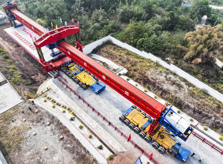2024年9月26日拍摄的成渝中线高铁重庆段首孔箱梁架设作业现场(无人机照片)。新华社记者 王全超 摄