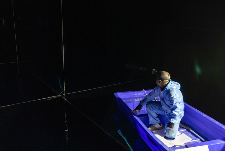 2023年4月21日,在位于四川省稻城县海子山的高海拔宇宙线观测站“拉索”水切伦科夫探测器阵列水池,科研人员坐船更换实验设备。新华社记者 金立旺 摄