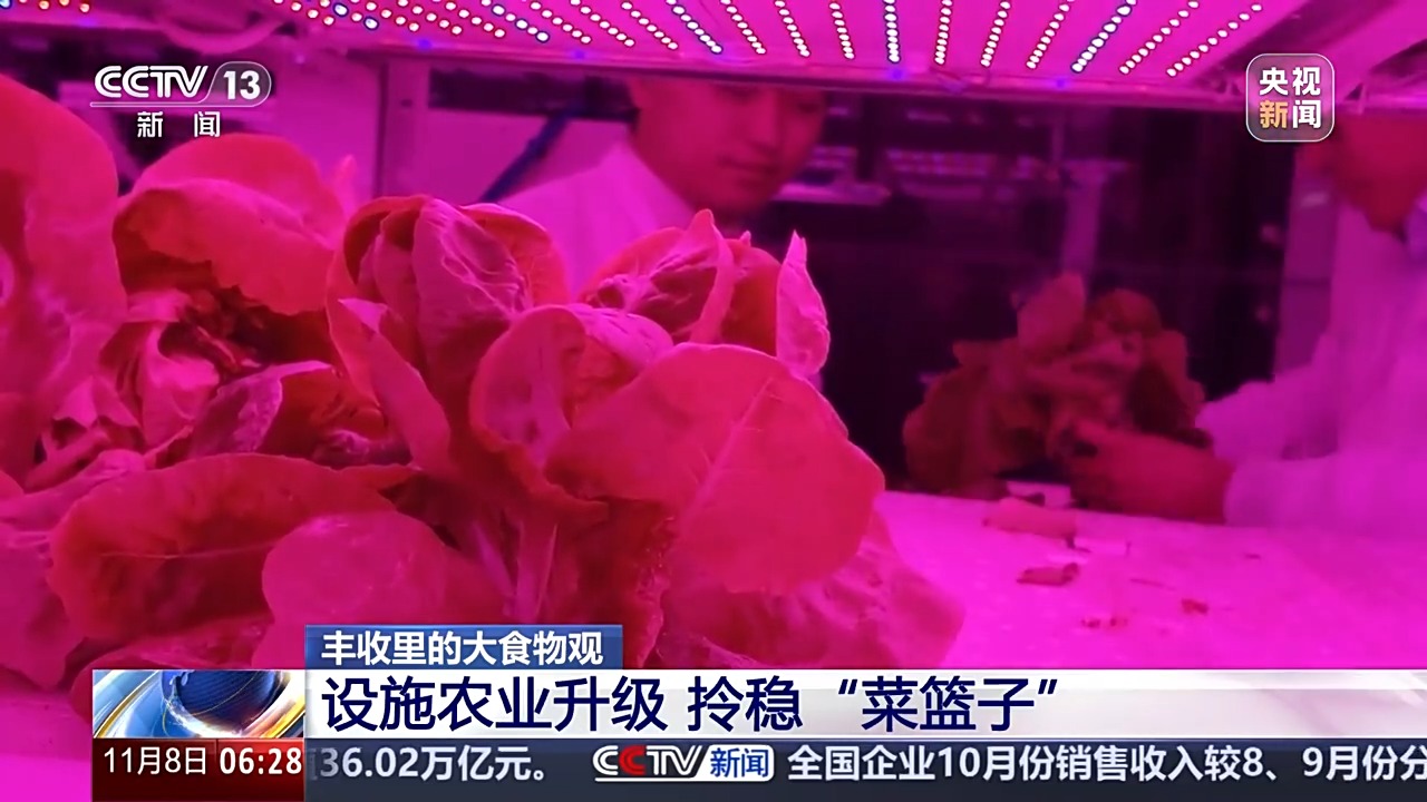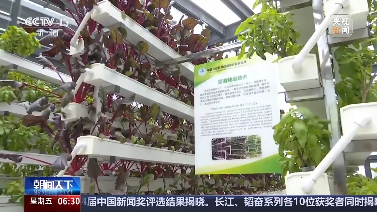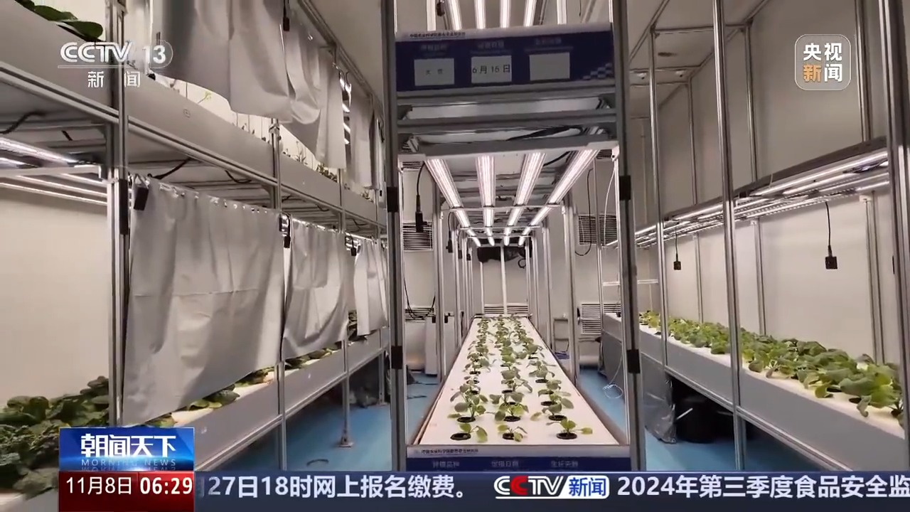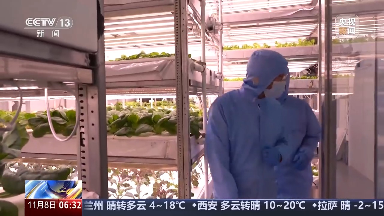 中国农业科学院都市农业研究所首席科学家 杨其长:用精准的营养液的一些配方技术,不同的生育期可以精准供应营养。另外一方面,我们用一些像光的调控技术,尤其是我们发现了一些信号光谱,像这个远红、绿光可以大幅度地缩短它的生育期,从定植到收获60天左右就可以收获。