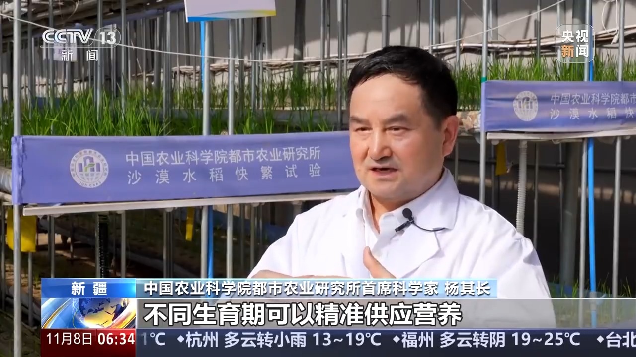 杨其长告诉记者,在和田,不少温室大棚都是建在推平的沙漠上,建设成本比内地用地便宜很多,而且和田特殊的地理条件是日照时间长,昼夜温差大,有利于作物品质提高。在攻克水稻生育期减半之后,目前,科研团队又在和田的沙漠温室里相继探索了大豆、玉米、小麦等主粮作物,以及油菜、棉花和苜蓿等作物的快速繁育关键技术。(记者 梁丽娟 刘成)