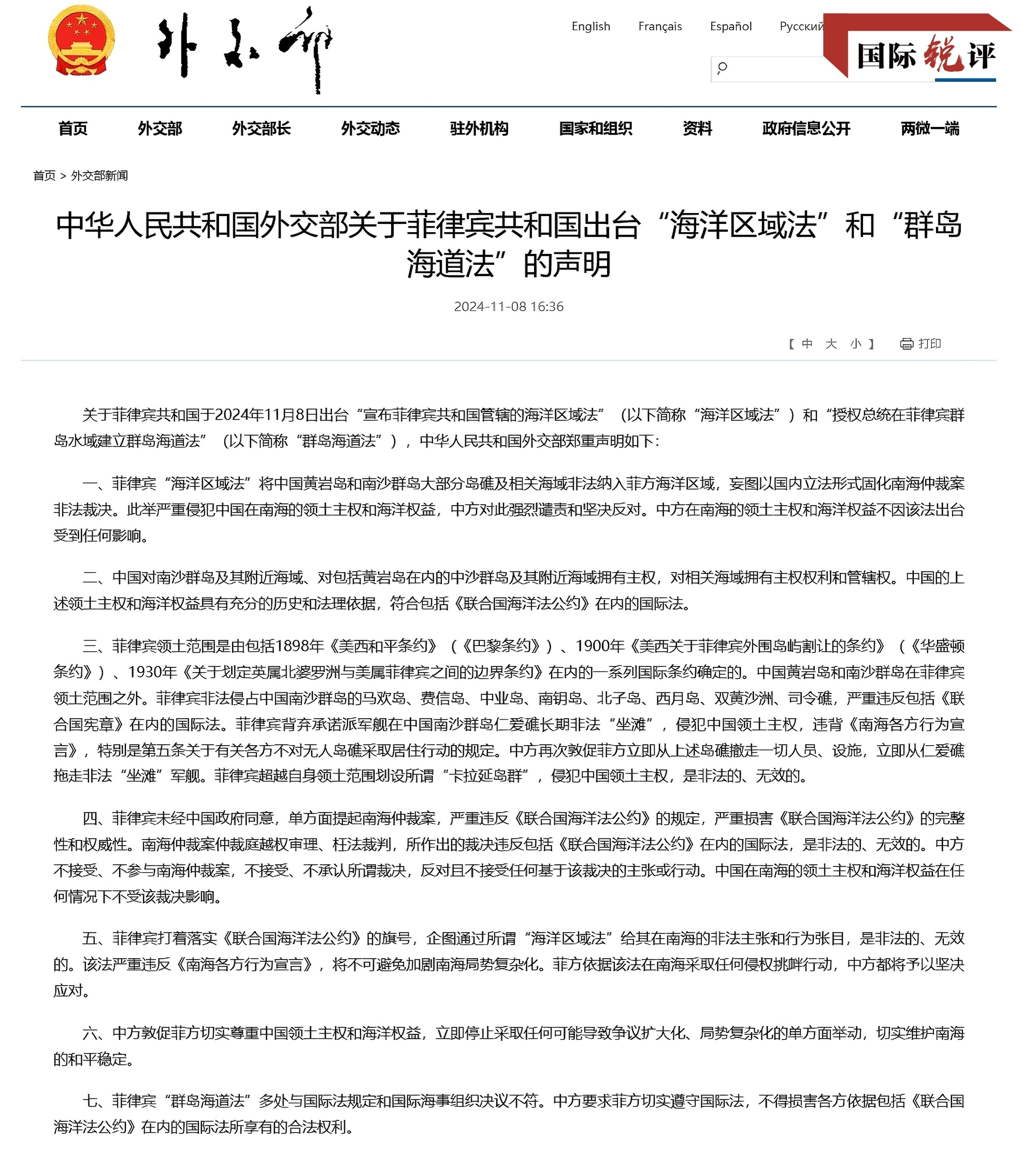由此可见,菲方出台的“恶法”违背了法律的基本精神,凸显出政治操弄的本质和非法扩张海洋权益的意图。中国对南沙群岛及其附近海域、对包括黄岩岛在内的中沙群岛及其附近海域拥有主权,对相关海域拥有主权权利和管辖权,这些有着充分的历史和法理依据。而菲律宾的领土范围是由1898年《美西和平条约》(《巴黎条约》)、1900年《美西关于菲律宾外围岛屿割让的条约》(《华盛顿条约》)等一系列国际条约确定的,中国黄岩岛和南沙群岛均在菲律宾领土范围之外。