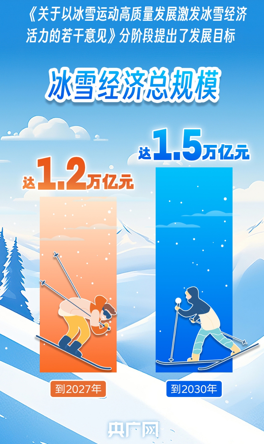 近日,国务院办公厅公开发布《关于以冰雪运动高质量发展激发冰雪经济活力的若干意见》(以下简称《意见》),分阶段提出发展目标:到2027年,冰雪运动场地设施更加完善,服务水平显著提升,冰雪运动更加广泛开展,冰雪经济总规模达1.2万亿元。到2030年,冰雪经济主要产业链条实现高水平协调融合发展,冰雪消费成为扩大内需的重要增长点,冰雪经济总规模达1.5万亿元。