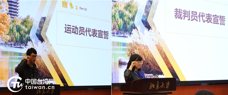 开幕式上,北京大学物理学院2023级本科生高铭泽、比赛副裁判长李娜分别代表运动员和裁判员宣誓。