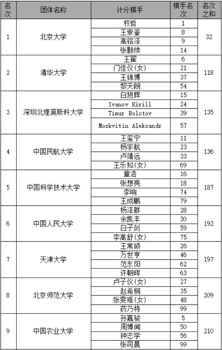经过一天7轮快棋的激烈角逐,北京大学以绝对优势夺得团体冠军。清华大学、深圳北理莫斯科大学、中国民航大学、中国科学技术大学、中国人民大学、天津大学、北京师范大学分获团体第2至8名。北京大学权哲以6分的优异成绩荣获公开组个人冠军,北京邮电大学陈喆、香港大学戴文智分别荣获公开组个人亚军、季军。中央财经大学李欣玙夺得女子个人冠军,国家体育总局体育科学研究所陈奕如、中国农业科学院赵雨轩分别荣获女子个人亚军、季军。在颁奖仪式上,侯逸凡和比赛仲裁主任姚振章、深圳北理莫斯科大学教师、特级大师赵雪、比赛裁判长姚垚、副裁判长李娜等为获奖高校和选手颁发了证书、奖杯和奖品。
