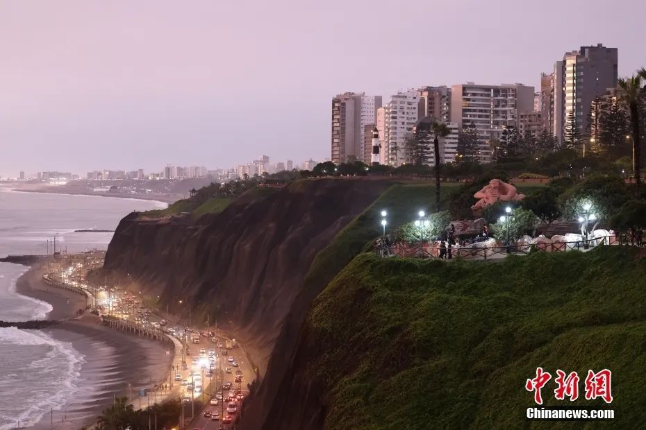 当地时间11月12日,秘鲁首都利马,日落时分的海岸线美景。中新社记者 盛佳鹏 摄