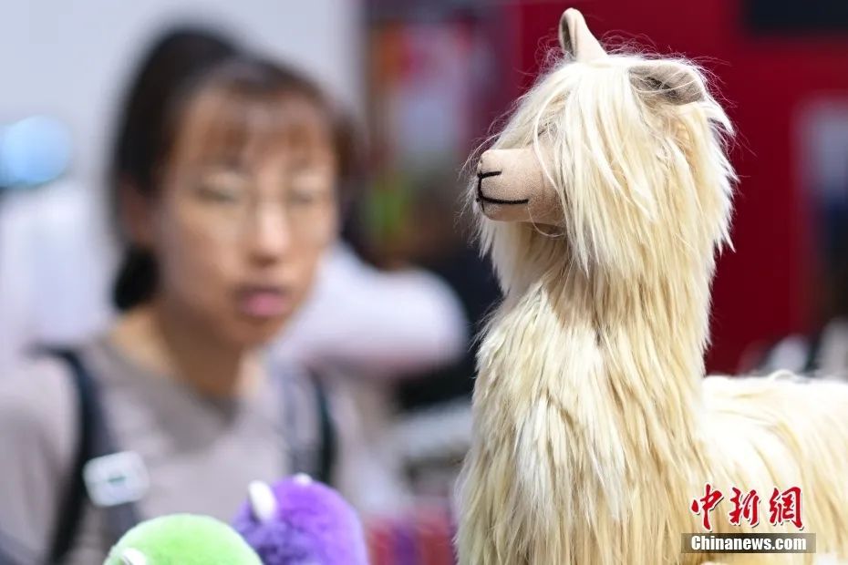 2023年9月4日,服贸会国家会议中心展区,秘鲁展台羊驼毛制品吸引参观者。中新社记者 田雨昊 摄