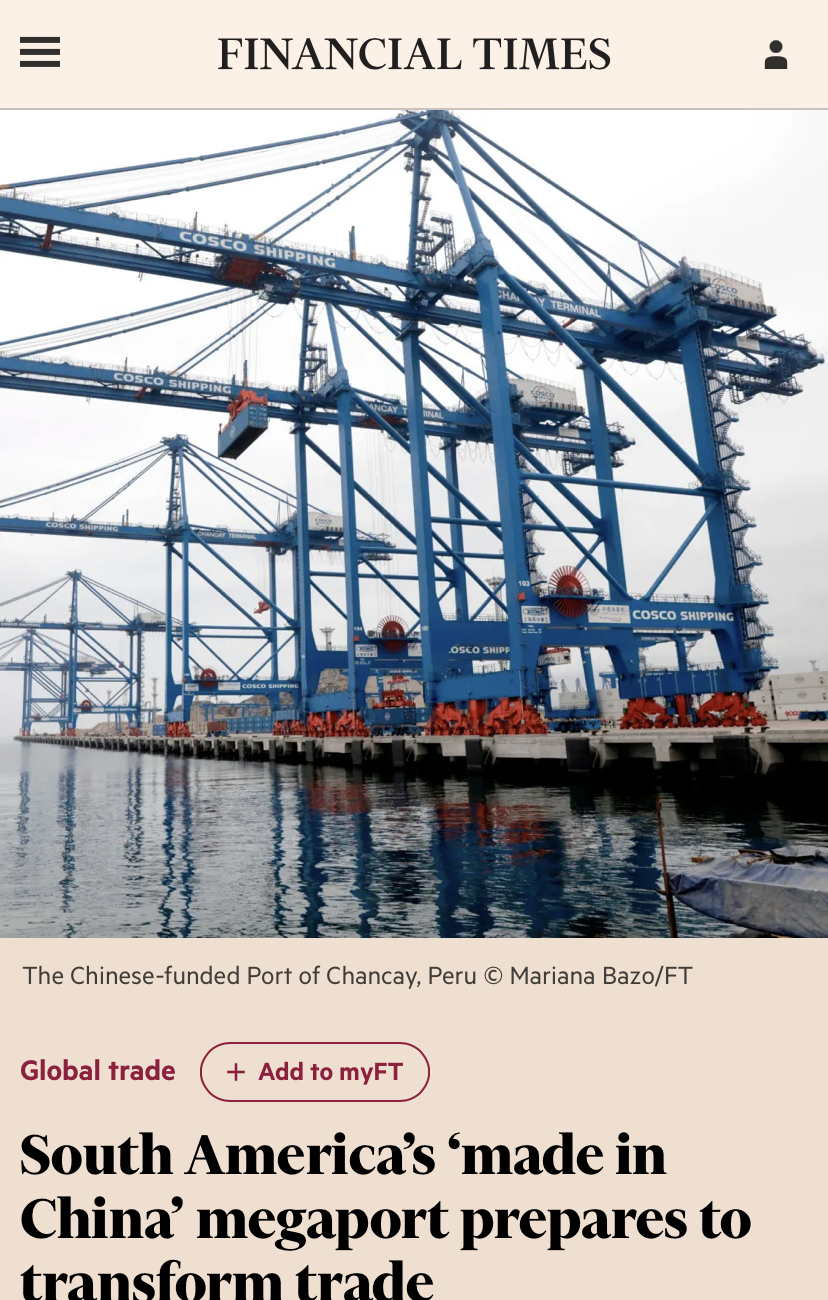 英国《金融时报》(Financial Times)网站13日报道,当地“一切都是中国制造,”中国远洋海运集团(Cosco Shipping)港口公共事务经理马里奥·德拉斯·卡萨斯(Mario de las Casas)满面笑容地对记者说道。他说:“这不仅是对秘鲁,这对整个地区都是一个巨大的机遇,”港口的路灯上飘扬着秘鲁和中国的国旗。