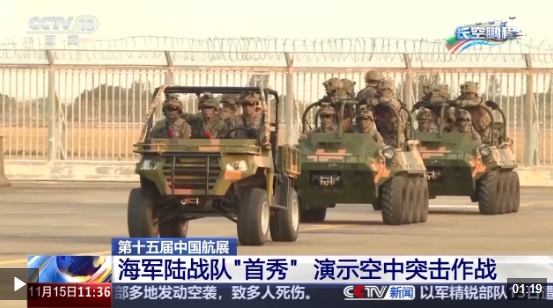 第十五届中国航展是海军陆战队员首次参加,除了演示舰载直升机飞行课目,还有搭载全地形山猫突击车及多名陆战队员进行快速突击,夺控敌目标的课目。