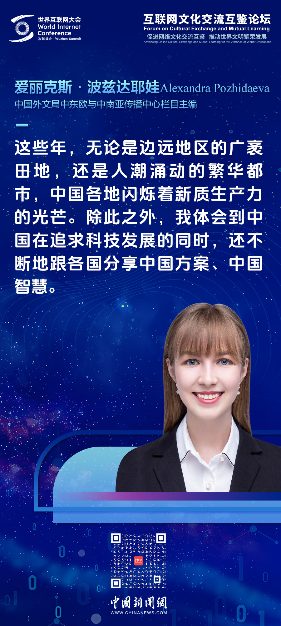 中新网乌镇11月21日电(林卓玮)“我希望站在外国人的视角,记录当下这个世界转折的风口,记录中国伟大的发展历程,创作出更多有深度、有温度的中国故事。”11月21日,在浙江乌镇举行的2024年世界互联网大会乌镇峰会互联网文化交流互鉴论坛上,俄罗斯籍媒体人爱丽克斯(Alexandra Pozhidaeva)用流利的中文讲述了自己长达9年的中国故事。