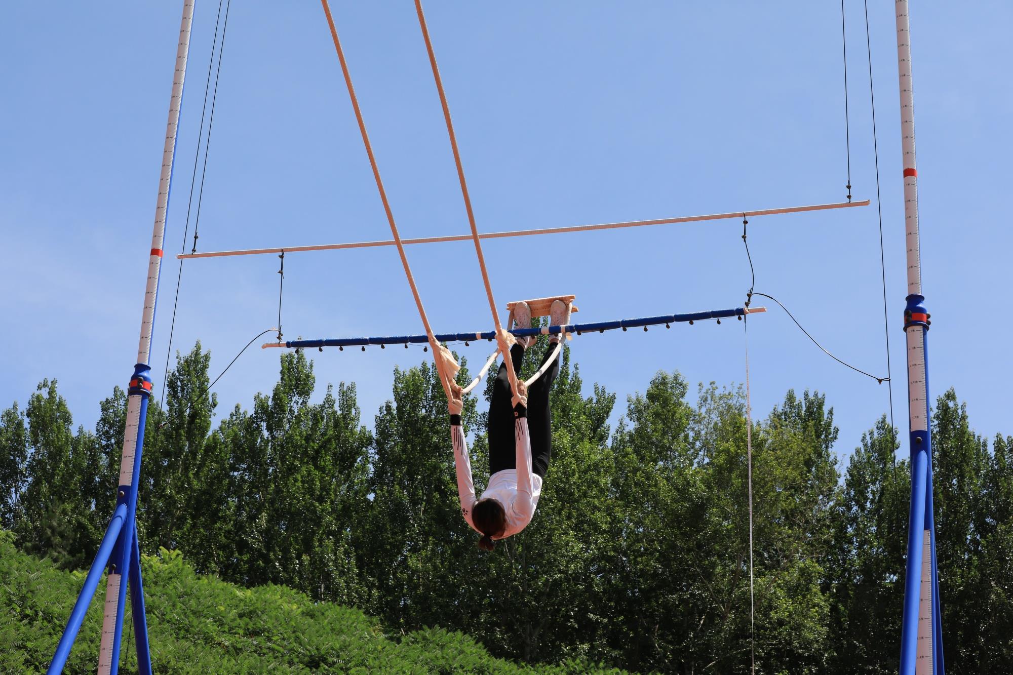 运动员在秋千架上试荡