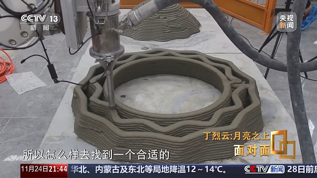 丁烈云:月壤成型它目前有几种成型,比方说一种成型它是通过碱激发,烧碱加水,把月壤能够凝固起来,或者加这种硫黄。然后再进行3D打印,但是一想你这不是百分之百的原位。