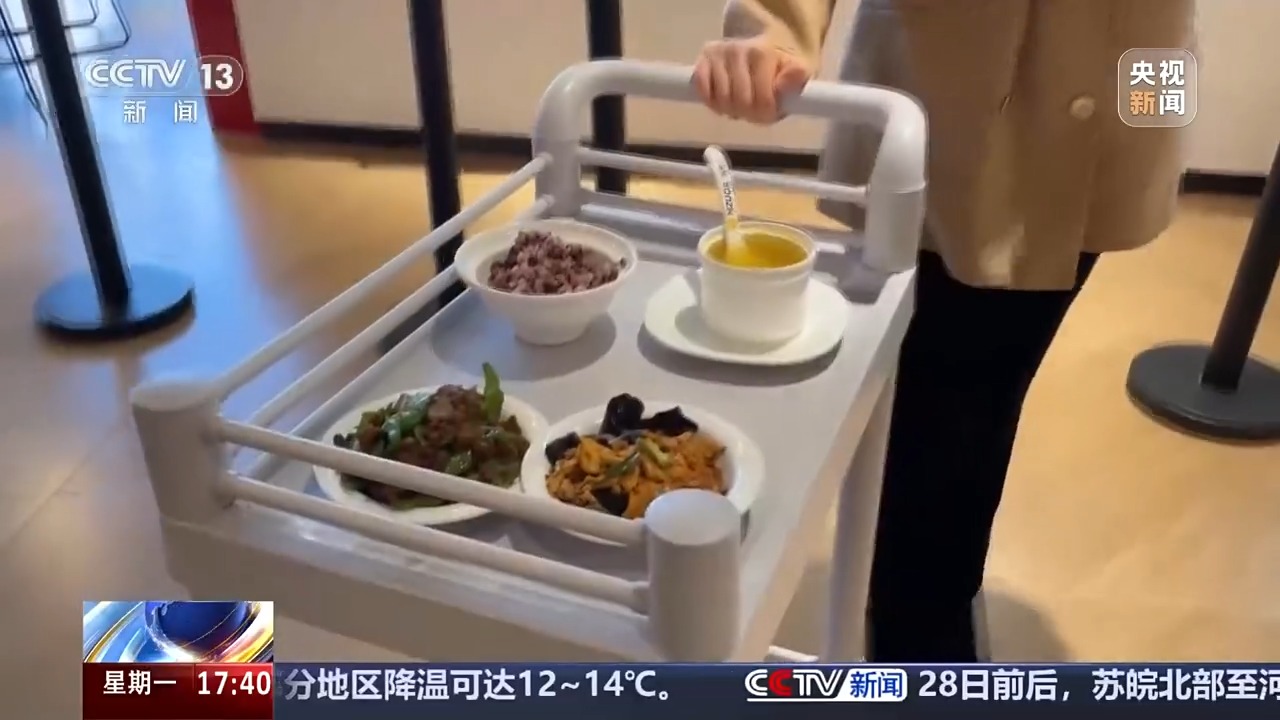 总台记者 袁嘉忆:在食堂的设施配备方面,我们也发现不少暖心的细节。考虑到有些老年人自己拿着托盘取餐可能不安全、不便捷,食堂准备了小推车,方便老人选餐,并且相应在就餐区域之间留有宽敞通道。在老人专座区,每张桌子上都装有服务呼叫器,老人在就餐过程当中出现不适的话可以及时呼救,呼叫信息会实时显示在工作人员佩戴的智能手环上。