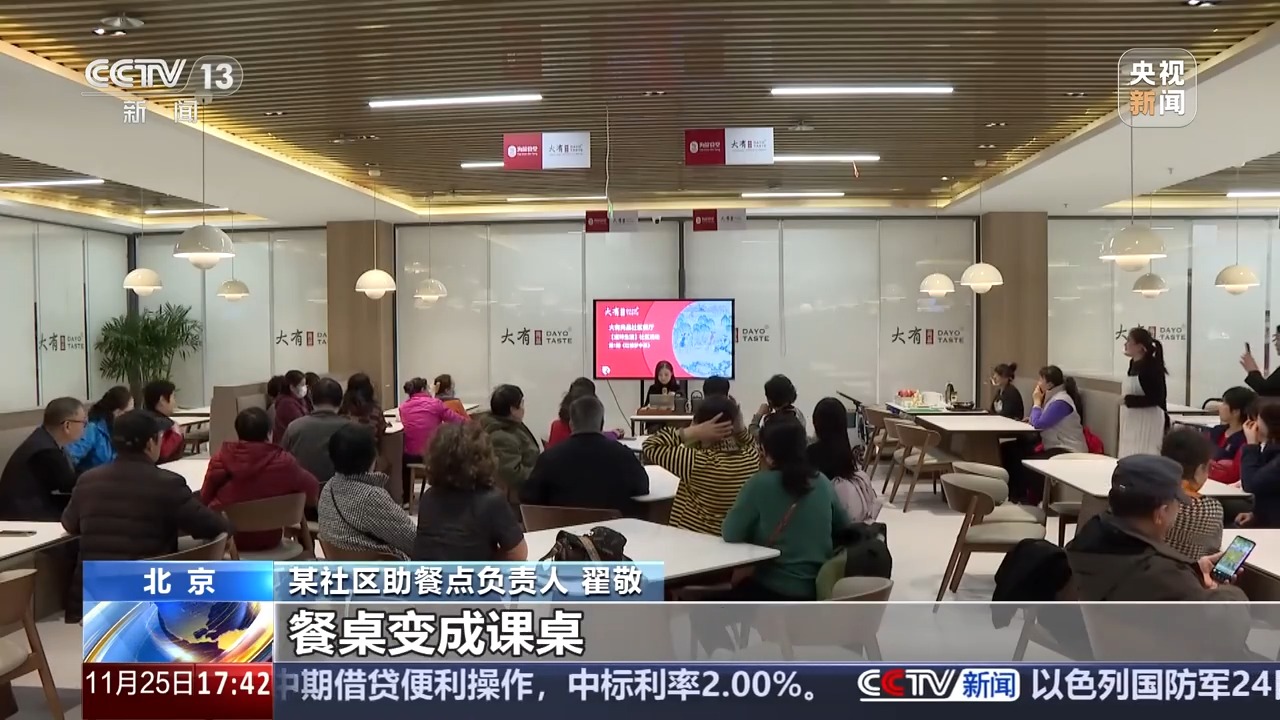 某社区助餐点负责人 翟敬:社区课堂的内容是跟街道一起联办的,餐桌变成课桌。老同志在饮食、健康上得到了满足,在精神上也得到了满足,给社区餐厅的经营达到了很好的引流作用。