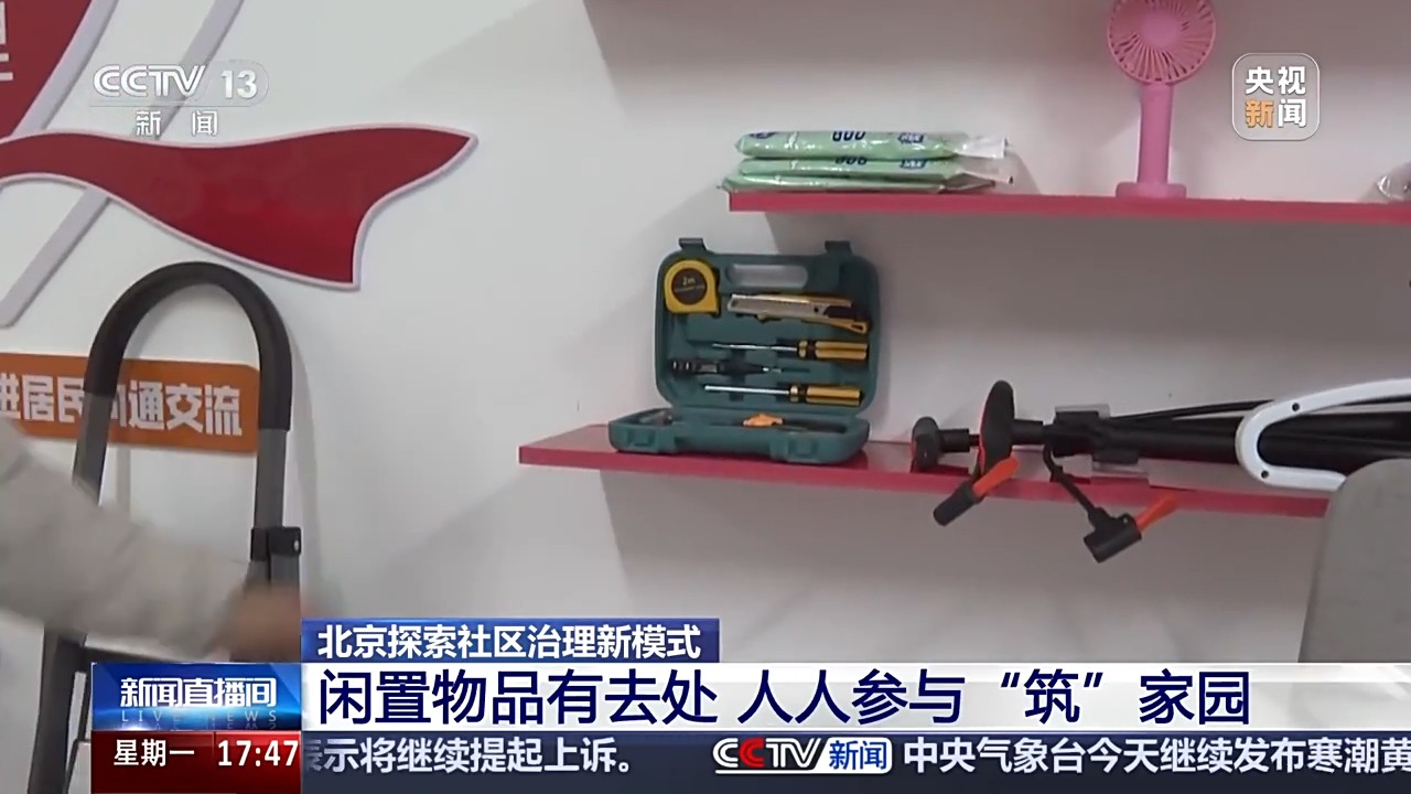 总台记者 康骏驰:我现在是在北京市大兴区的福海佳园社区,这个小屋是小区居民们在街道和社区共同指导下打造的共享小屋,那这个小屋里有什么?进到小屋后,我们可以看到摆满了各种各样的生活用品和工具,比如说小孩用到的婴儿车,修理东西时经常用的、在家里比较占地方的梯子,还有扳手、螺丝刀,以及搬家、搬运物品的小推车,这些都是免费向市民们提供使用的。