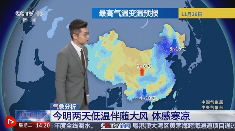 中国气象局气象分析师胡啸表示,寒潮天气过程将会在11月28日前后趋于结束,但是在结束之前仍要关注大风降温和强降雪天气。26日早晨相比25日同一时刻,中东部大部地区气温已经出现明显的下降,体感寒凉。