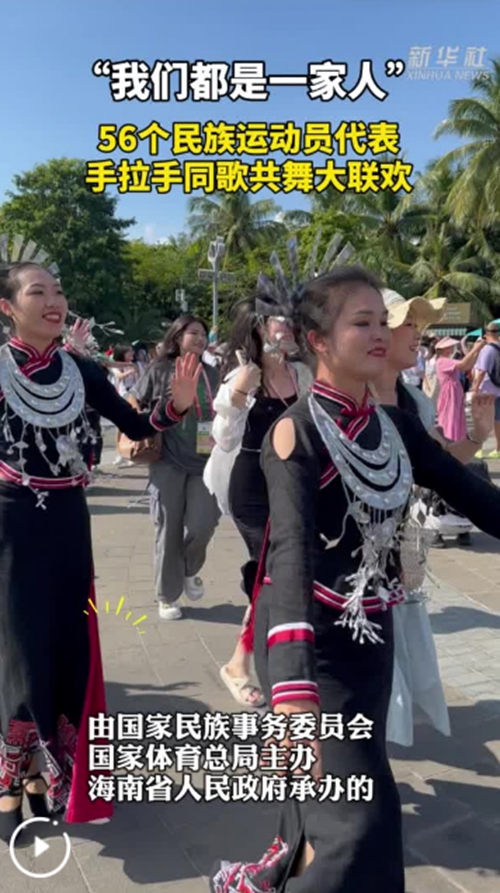 11月26日,第十二届全国少数民族传统体育运动会民族大联欢在海南三亚举行。在活动现场,56个民族的运动员代表一起手拉手,同歌共舞大联欢。