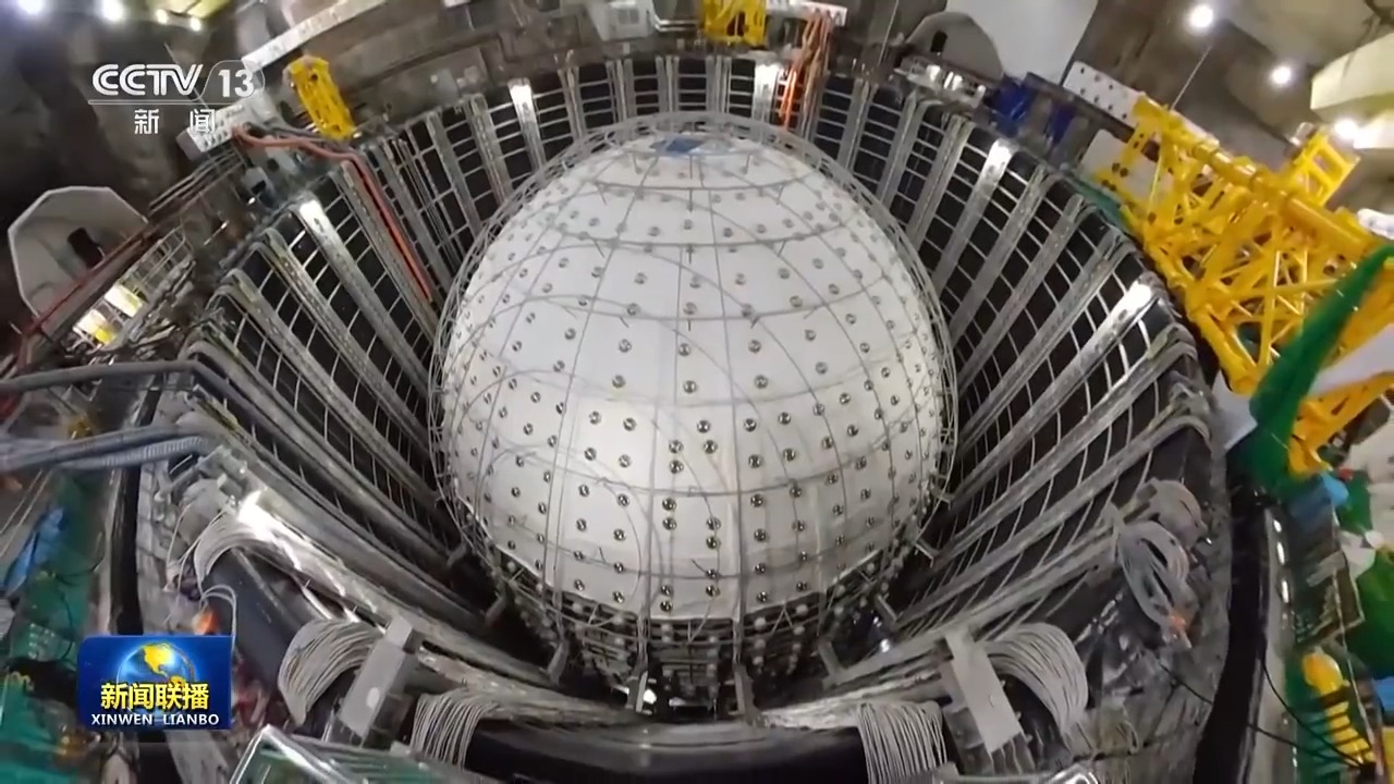 总台央视记者 帅俊全:探测器主体建成之后,在这个约15层楼高的水池内部将会注满超纯水,然后自上而下在有机玻璃球体内部置换为液体闪烁体。从明年开始,整个装置将正式运行,开始捕获、探测中微子,设计寿命为30年。