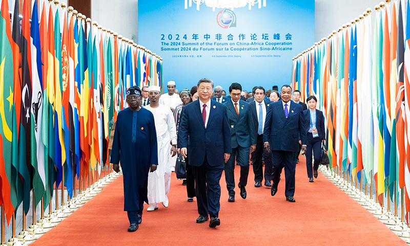 2024年9月5日,习近平主席在北京人民大会堂出席中非合作论坛北京峰会开幕式并发表主旨讲话。这是习主席同外方领导人共同步入会场。