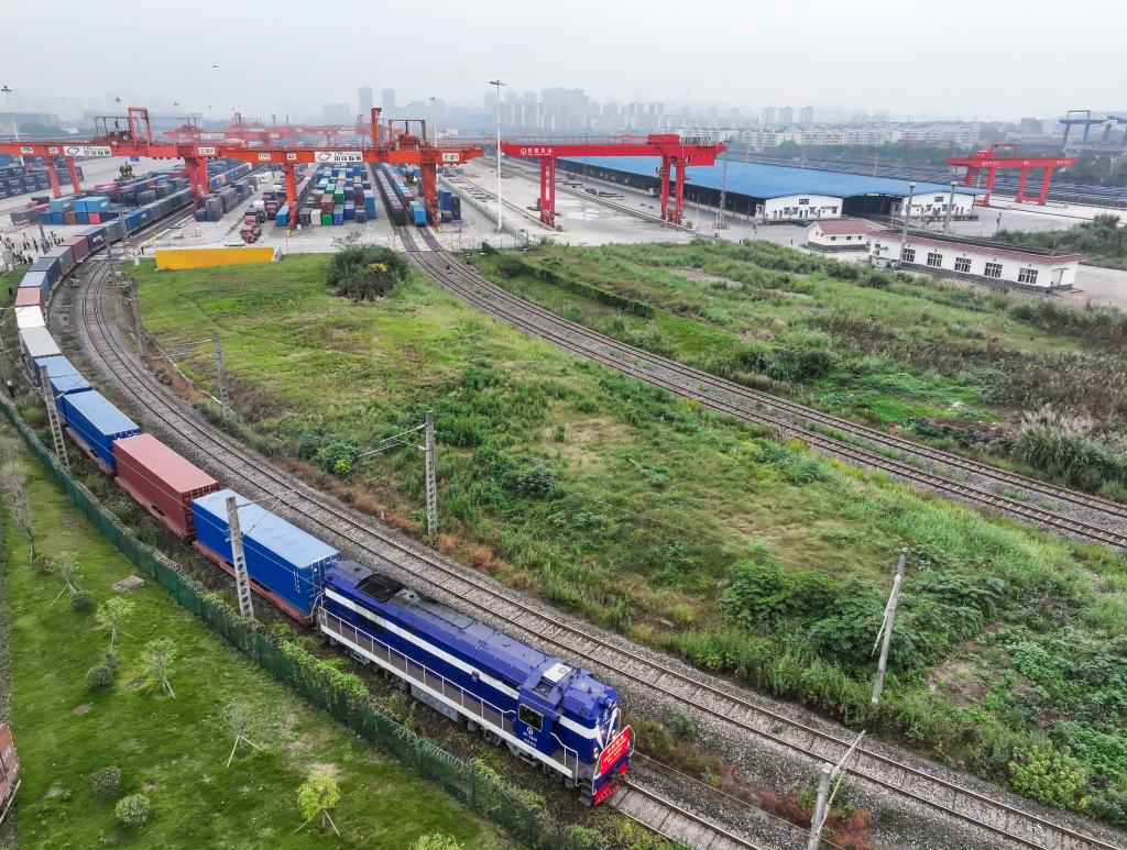 11月15日,第10万列中欧班列——X8083次中欧班列(重庆—杜伊斯堡)从重庆团结村中心站开出(无人机照片)。新华社记者 王全超 摄