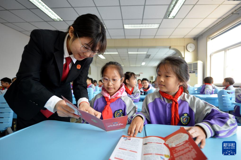 12月3日,在山东青岛寿光路小学开展的宪法知识进校园活动上,法官在指导学生学习宪法知识。