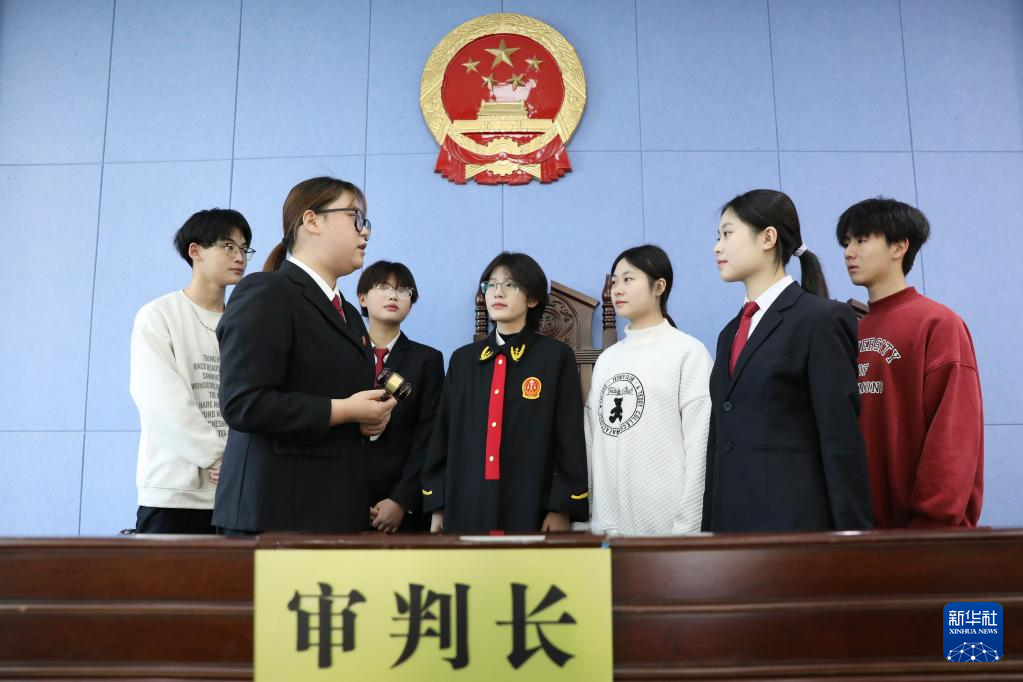12月3日,河南省焦作市温县人民法院法官职雨洁为温县职教中心学生讲解法槌的作用。