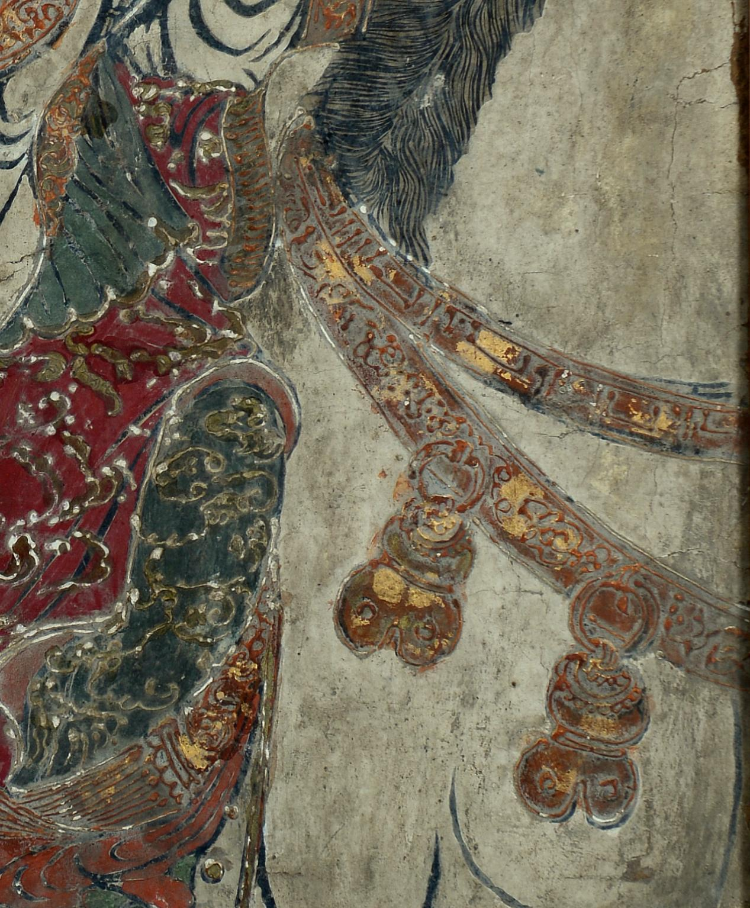 为了让壁画更加栩栩如生,画工们匠心独运,大面积使用了沥粉贴金工艺。尤其在“圣母出行图”中,人物的衣纹和乐器上普遍使用了沥粉,在细节的装饰上还用了贴金,让画面不仅立体而且更加富丽,堪称民间画师佳作。