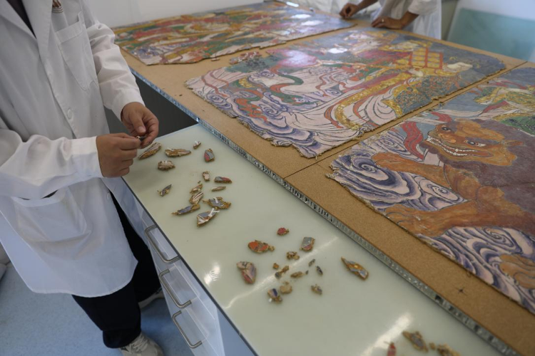 首先,壁画是被切割保护的,所以修复师依据原切割缝两侧的绘画线条和色泽,找到对应位置,把壁画拼对起来,保证画面的完整性。