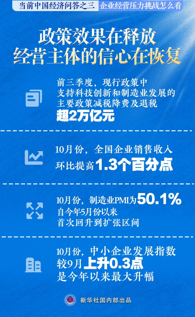 10月份,全国企业销售收入同比增长,环比提高1.3个百分点;制造业PMI为50.1%,自今年5月份以来首次回升到扩张区间;非制造业商务活动指数连续数月稳定在50%左右;中小企业发展指数较9月上升0.3点,是今年以来最大升幅。