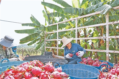 在位于老挝首都万象的中国—老挝合作农作物优良品种试验站,当地农户正在分拣火龙果。