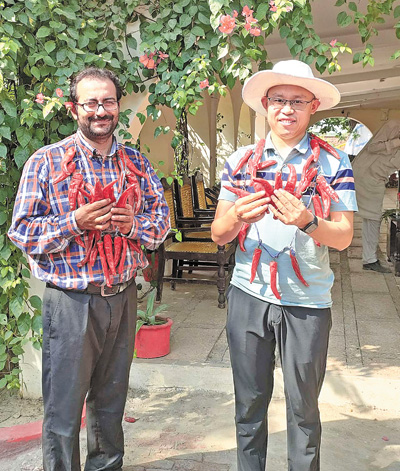 参与中国—巴基斯坦辣椒种植合作项目的中国专家与当地技术员共同庆祝辣椒丰收。