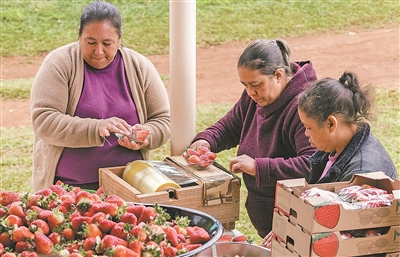 中国三峡巴西公司在位于巴西南部格利保吉水电站周边开展创收创业试点项目。图为当地农户正在分装草莓。
