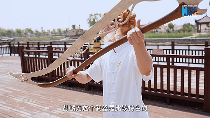 麒麟刀是传统器械的一种,属于长兵器,全套动作以劈、砍、斩、撩、挂、挑、匀、扫为主。在可欣的眼中,麒麟刀很大也很重,但动作有气势,在习练过程中体会到了中华传统武术的精神和魅力。
