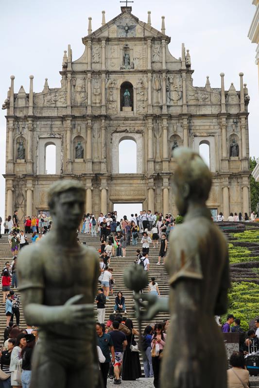 △2024年11月18日,游客在澳门大三巴牌坊游玩参观。