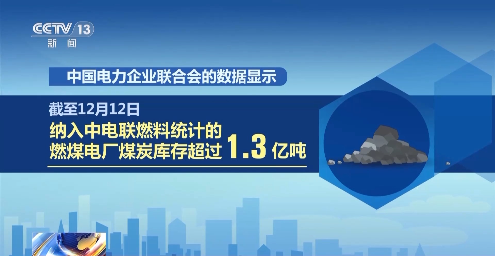 中国电力企业联合会的数据显示,截至12月12日,纳入中电联燃料统计的燃煤电厂煤炭库存超过1.3亿吨,较去年同期增加1221万吨,库存可用天数26.1天,较上年同期提高2.2天。