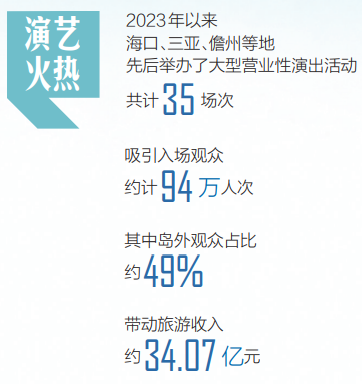 据省旅游和文化广电体育厅不完全统计,2023年以来,海口、三亚、儋州等地先后举办了大型营业性演出活动共计35场次,吸引入场观众约计94万人次,其中岛外观众占比约49%,带动旅游收入约34.07亿元。