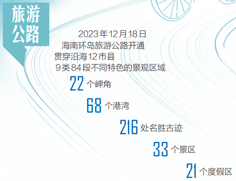 一路一风景、一段一故事、一城一特色,自2023年12月18日正式开通以来,海南环岛旅游公路一跃成为海南最受欢迎的新晋打卡地。贯穿沿海12市县、9类84段不同特色的景观区域,还有22个岬角、68个港湾、216处名胜古迹、33个景区、21个度假区……一条路串联起了海南多元素、深层次的自然与人文景观,让人们对到海南旅游有了更多的想象空间。