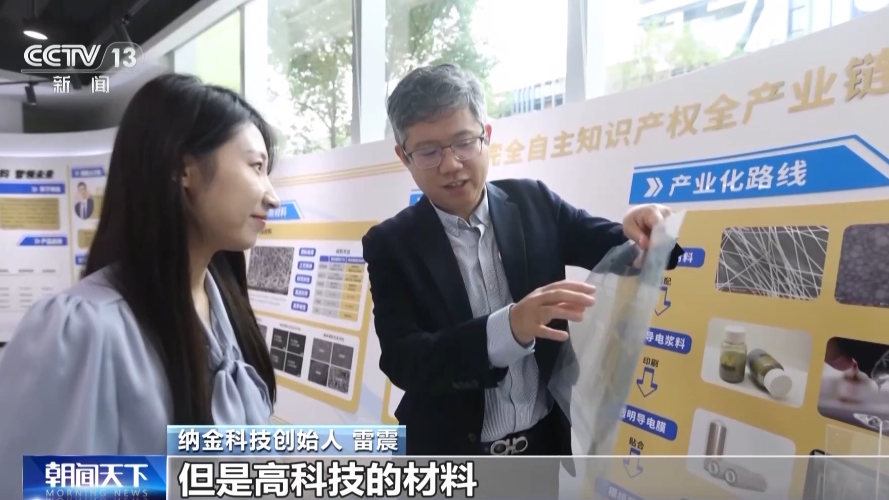 纳金科技创始人 雷震:平平无奇的一张膜,但是高科技的材料已经富含在里面了,这些位置印刷了一层纳米银线的材料,直径大约相当于人头发丝的万分之一,柔性、耐弯折、灵敏度高、电阻更低、功耗更小,成本还能比传统的薄膜降低30%左右,所有的材料和印刷工艺都是我们自己的技术,完全自主可控。