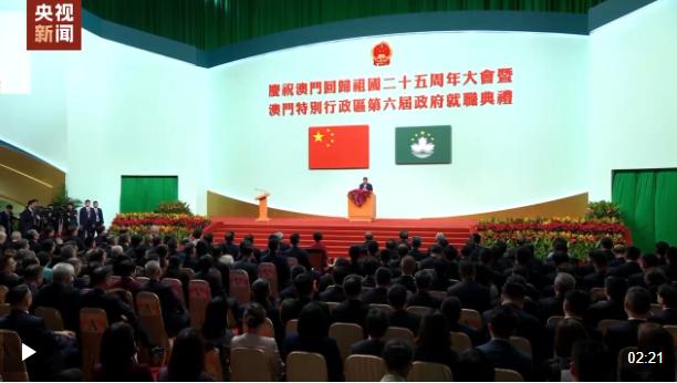 12月20日上午,庆祝澳门回归祖国25周年大会暨澳门特别行政区第六届政府就职典礼举行。中共中央总书记、国家主席、中央军委主席习近平出席并发表重要讲话。