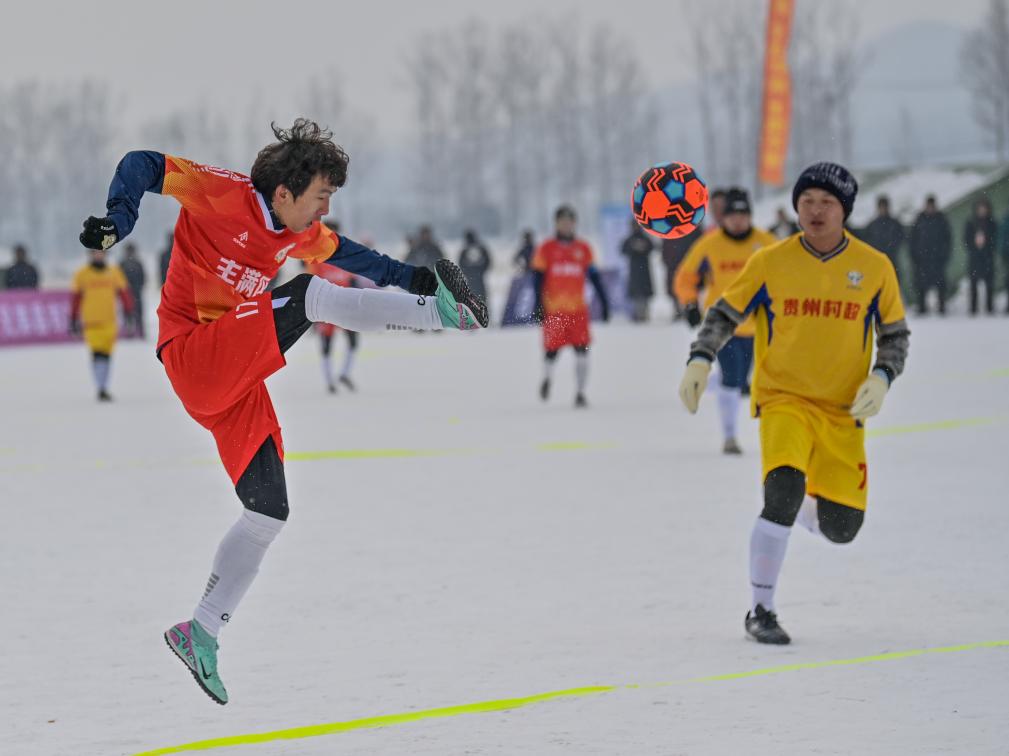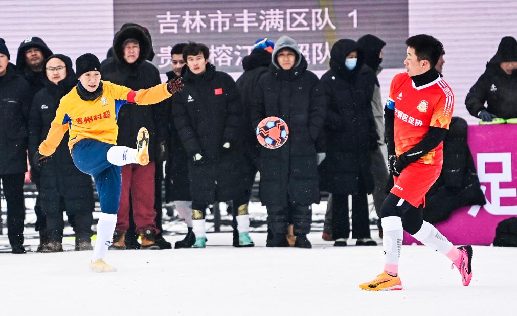 12月23日,南北乡村雪地足球邀请赛在吉林省舒兰市小城镇南阳村举行。贵州省榕江县的贵州村超队从3000公里外远赴东北,与东道主吉林市丰满区代表队在冰天雪地中开展一场友谊赛。