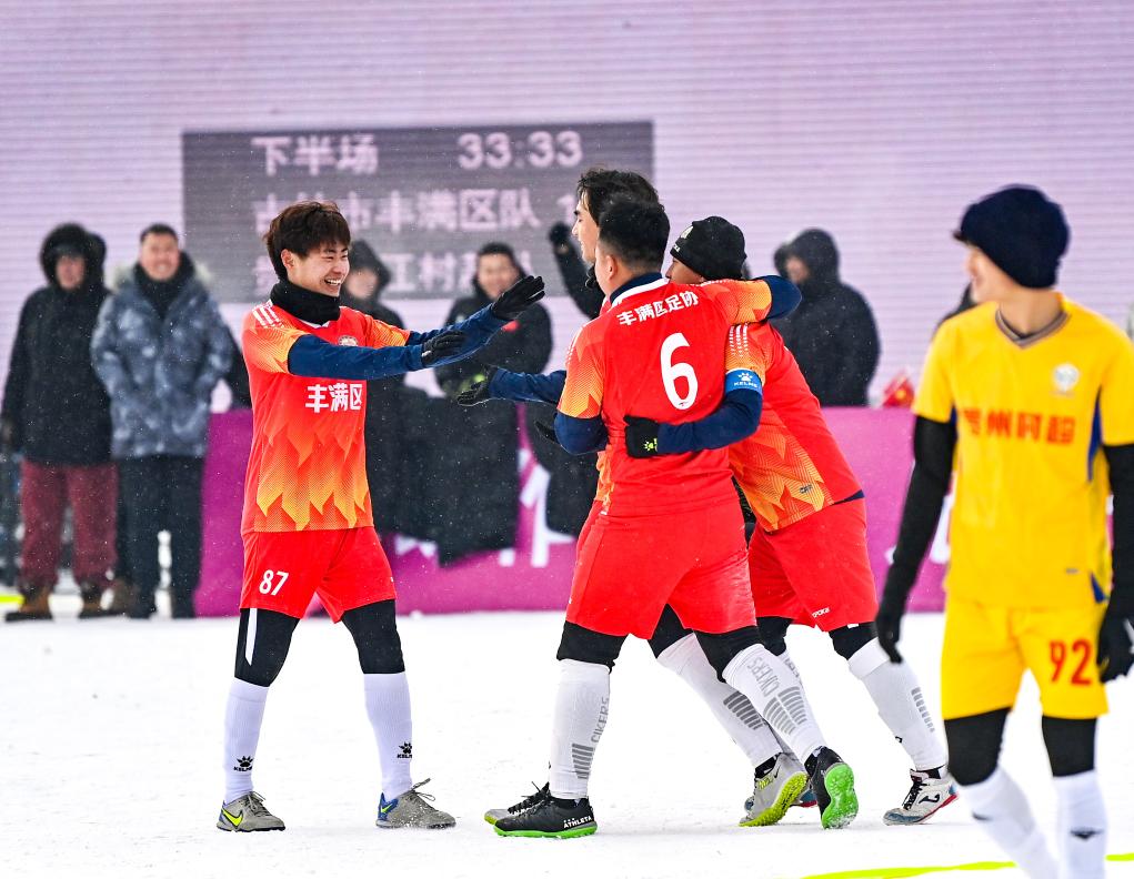 ↑12月23日,吉林市丰满区代表队在比赛中庆祝进球。新华社记者 颜麟蕴 摄