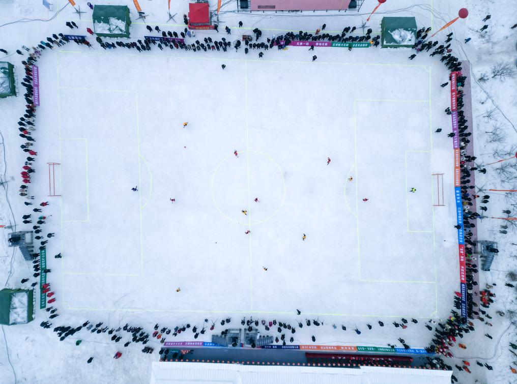 ↑这是12月23日拍摄的南北乡村雪地足球邀请赛比赛现场(无人机拍摄)。新华社记者 颜麟蕴 摄
