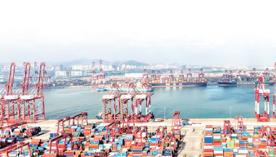 山东青岛,青岛港外贸集装箱码头一派繁忙景象。